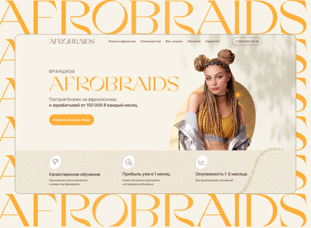 Сайт франшизы брейдов и афрокосичек, отличающийся стильным дизайном и удобством использования. Он выделяет преимущества бизнеса в быстрорастущем рынке красоты, предлагая доходные франшизы, и мотивирует предпринимателей присоединиться.